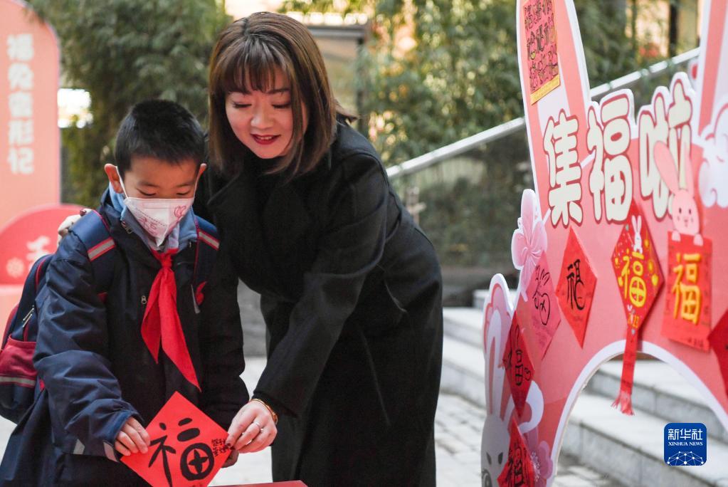 2月6日,在西安市新城區后宰門(mén)小學(xué),教師劉明幫學(xué)生將自制福字放入集福箱。