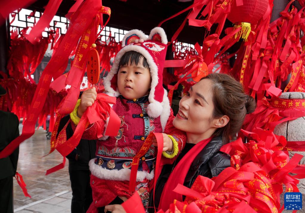 2月6日,一名家長(cháng)帶著(zhù)小朋友在全椒縣太平橋上系“平安帶”祈福。
