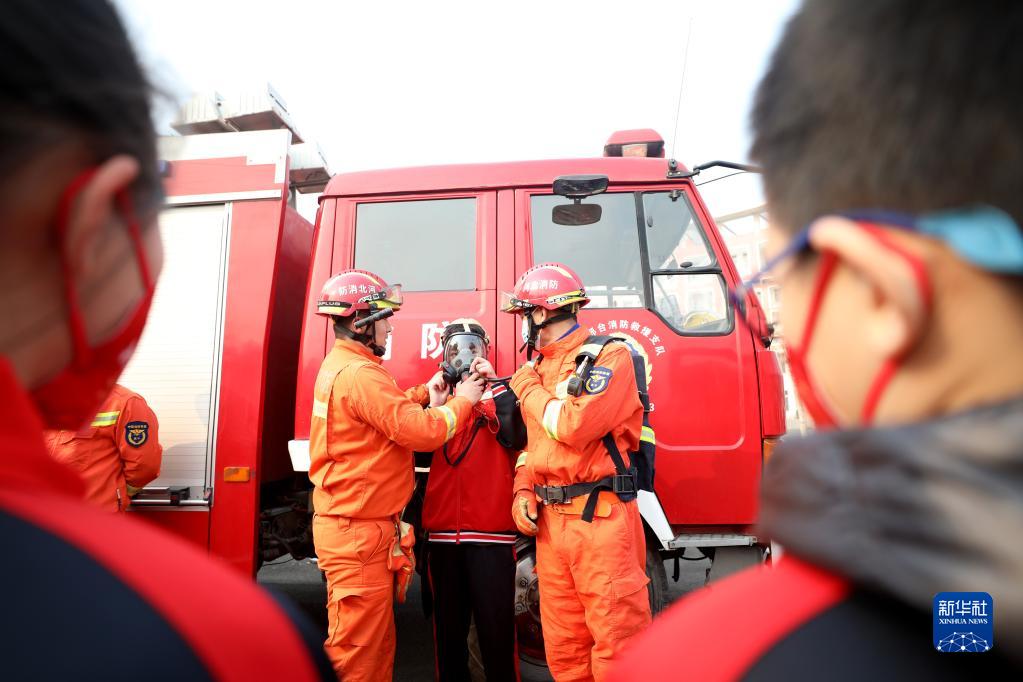 2月6日,在隆堯縣第二實(shí)驗小學(xué),學(xué)生在消防員指導下體驗正壓式空氣呼吸器。