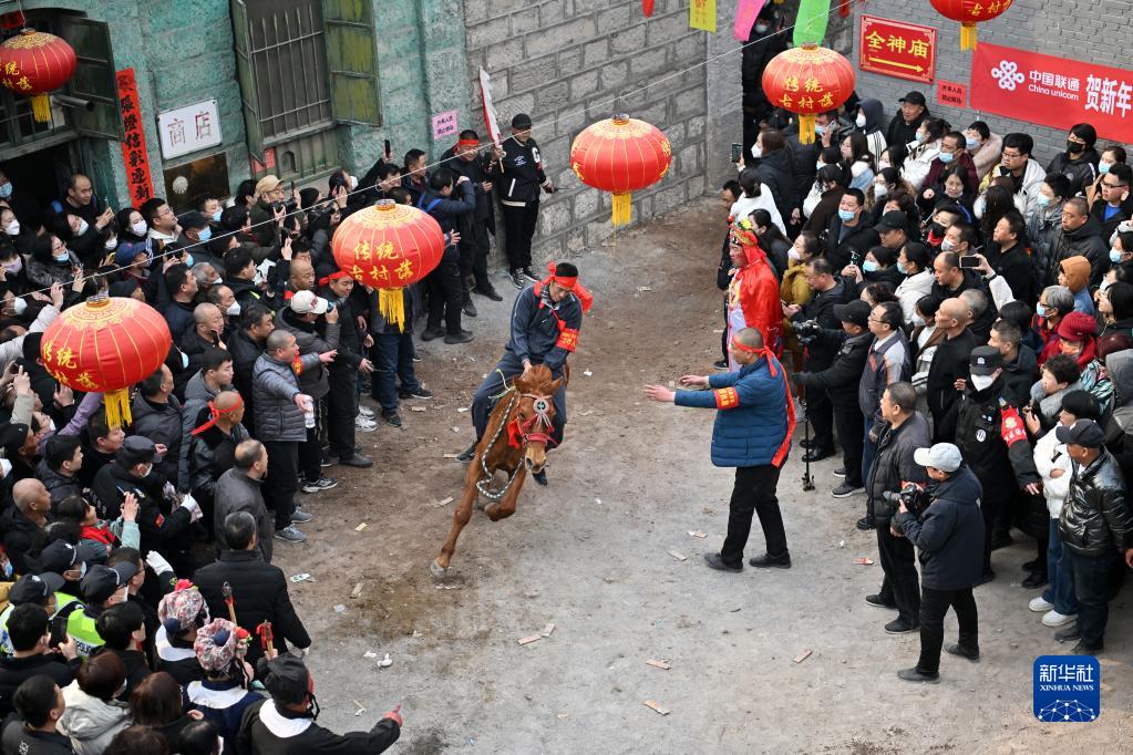 當日是農歷正月十六,山西省陽(yáng)泉市平定縣下董寨村熱鬧非凡,當地特有的民俗活動(dòng)——“跑馬排”上演,村民騎著(zhù)馬在古巷里來(lái)回飛奔,吸引眾多游客觀(guān)看。