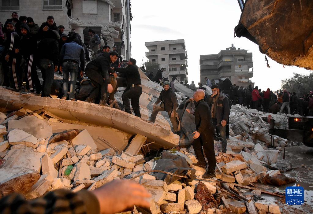 2月6日,人們在敘利亞哈馬省一處倒塌的建筑上進(jìn)行救援。