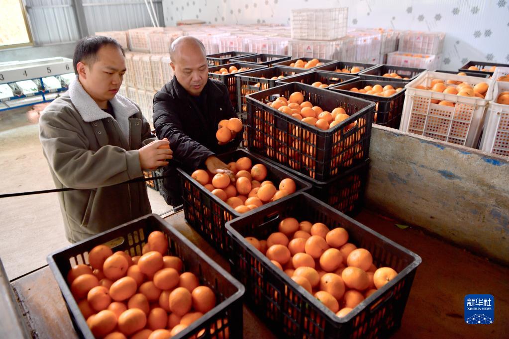 福斗村返鄉創(chuàng )業(yè)種植高山水果的村民陳繩春(右)與侄兒在分揀車(chē)間內查看收獲的沃柑(2月5日攝)。
