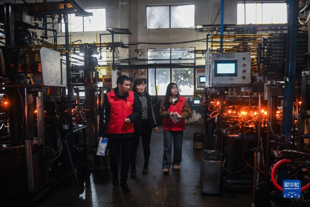 2月7日,在杭州市臨安區太陽(yáng)鎮的一家玻璃制品企業(yè)車(chē)間內,黨員助企服務(wù)小分隊的志愿者向企業(yè)負責人(中)了解企業(yè)目前遇到的實(shí)際困難。