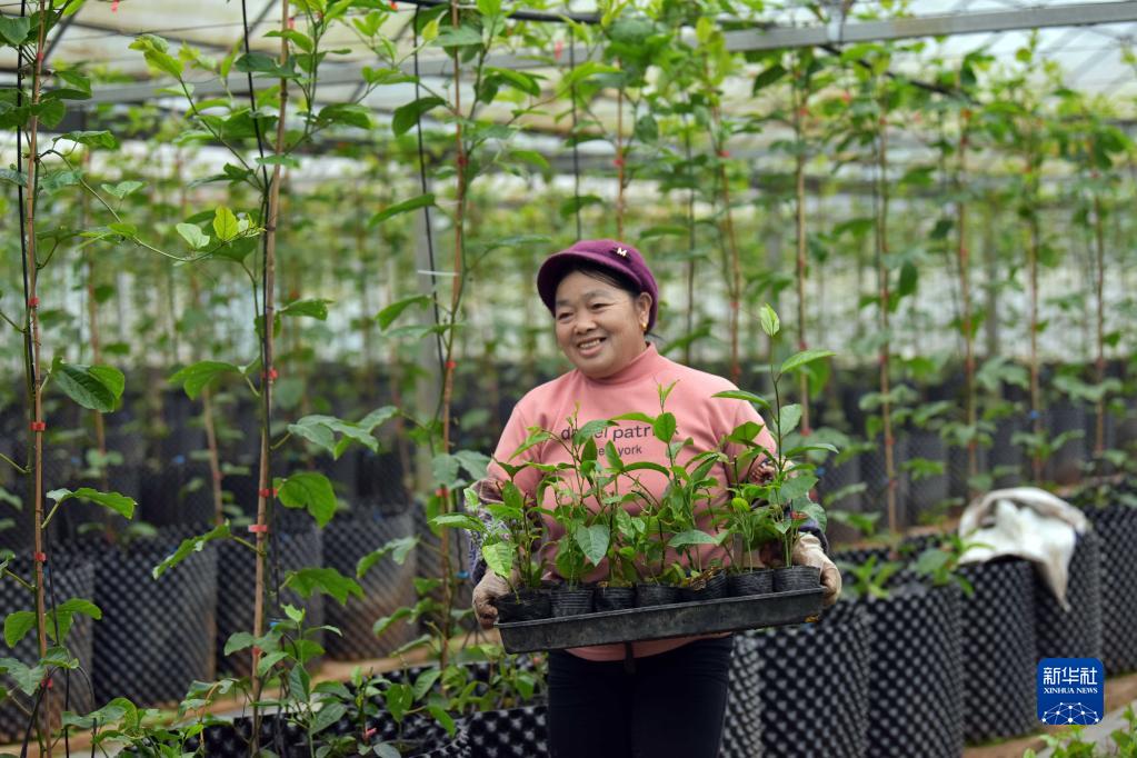 2月7日,工人在貴州省黔東南苗族侗族自治州從江縣貫洞鎮一家種苗繁育基地搬運百香果秧苗。