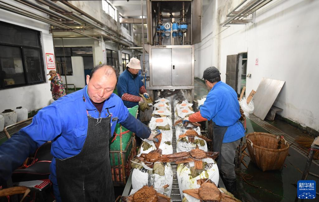 2月7日,在位于紹興市越城區的古越龍山釀酒一廠(chǎng),工作人員將完成春榨的酒用傳統的荷葉、竹殼封壇。新華社記者 翁忻旸 攝