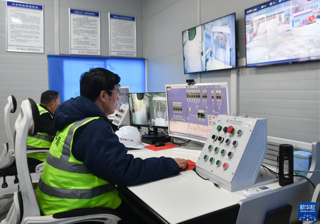 2月6日,中鐵二十局工人在位于陜西省商洛市的西十高鐵一號拌和站控制室監控設備運行情況。