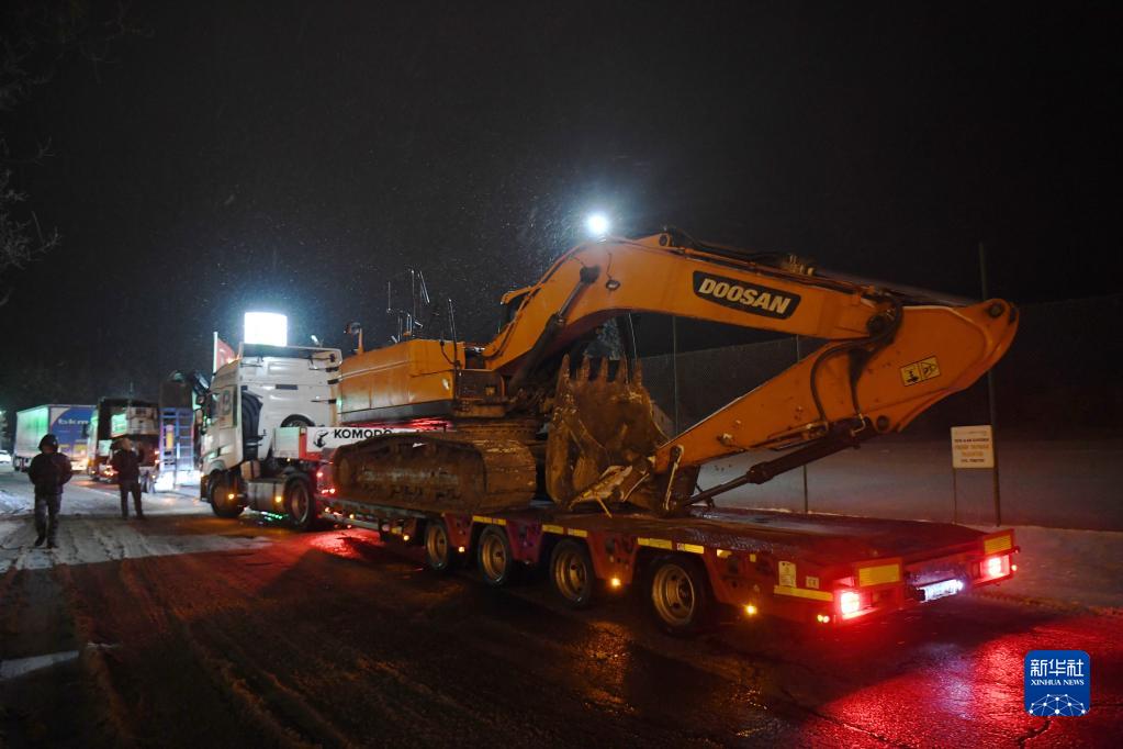 這是2月6日晚在土耳其伊斯坦布爾至安卡拉公路上拍攝的運往災區的大型機械。