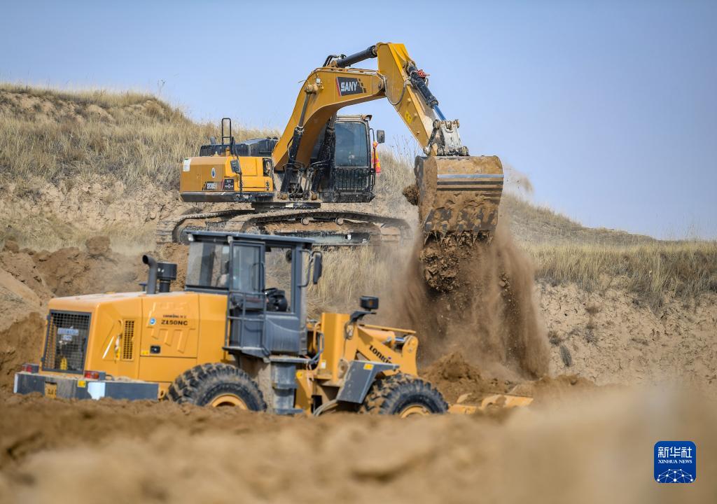 2月7日,工人操作挖掘機、推土機在寧夏固原市西吉縣硝河鄉蘇溝村平整土地。