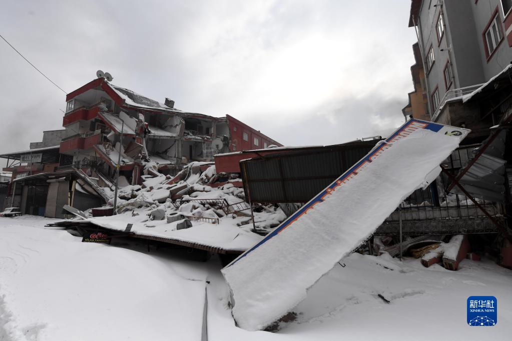 這是2月7日在土耳其卡赫拉曼馬拉什省南部的埃爾比斯坦地區拍攝的地震中受損的建筑物。