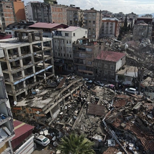這是2月7日在土耳其南部卡赫拉曼馬拉什市市中心拍攝的震后景象(無(wú)人機照片)??ê绽R拉什市是本次地震重災區卡赫拉曼馬拉什省省會(huì ),是遭受地震破壞最為嚴重的城市之一。