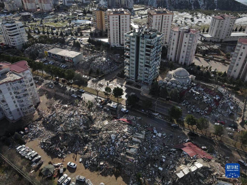 這是2月7日在土耳其南部卡赫拉曼馬拉什市市中心拍攝的震后景象(無(wú)人機照片)??ê绽R拉什市是本次地震重災區卡赫拉曼馬拉什省省會(huì ),是遭受地震破壞最為嚴重的城市之一。