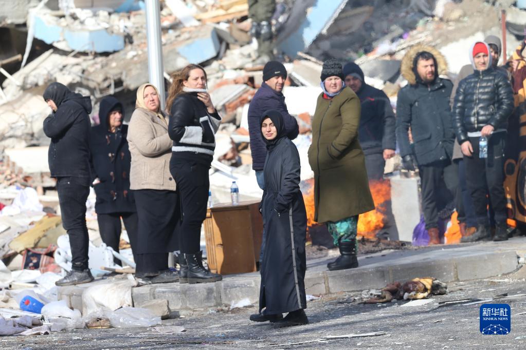 2月7日,災民在土耳其南部卡赫拉曼馬拉什市一處地震廢墟前守候。