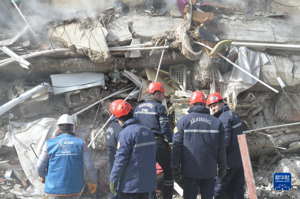 2月7日,救援人員在土耳其南部卡赫拉曼馬拉什市地震廢墟中搜尋幸存者。