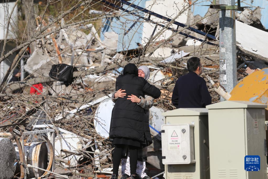 2月7日,災民在土耳其南部卡赫拉曼馬拉什市一處地震廢墟前相互安慰。