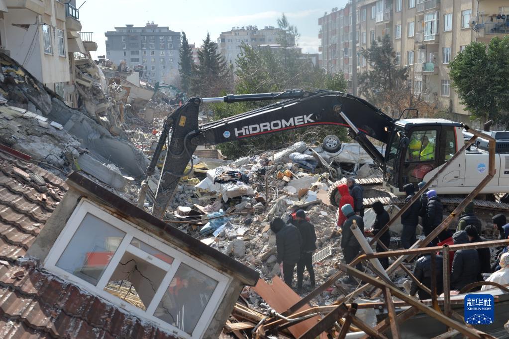 2月7日,人們聚集在土耳其南部卡赫拉曼馬拉什市一處地震廢墟。