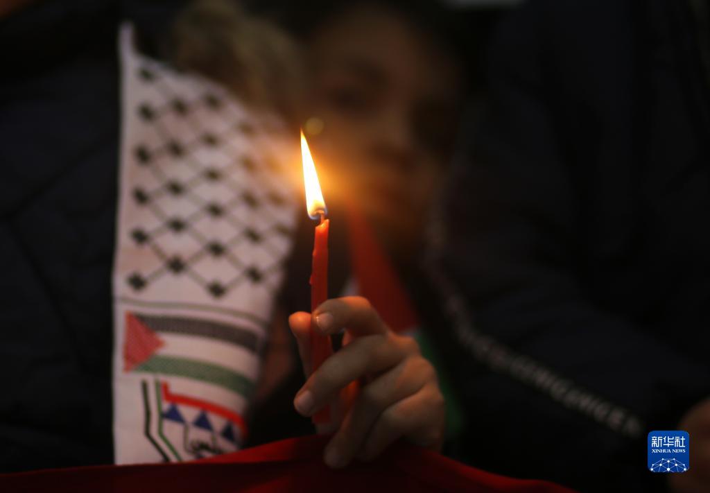 2月7日,在加沙地帶汗尤尼斯,一名兒童手拿蠟燭悼念地震遇難者。