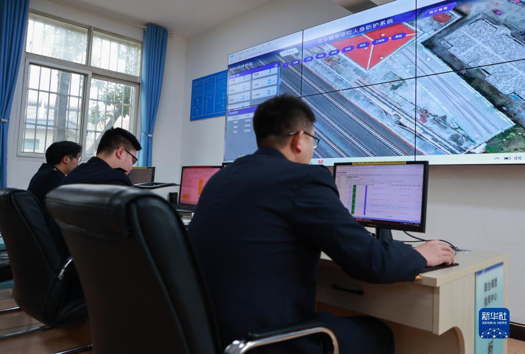 2月8日,工作人員在聯(lián)合調度指揮中心內通過(guò)監控查看北斗精準定位人身防護系統。