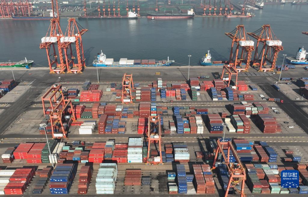 2月8日,輪船靠泊在唐山港京唐港區集裝箱碼頭(無(wú)人機照片)。