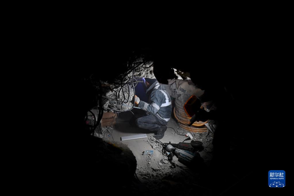 2月7日晚,在土耳其卡赫拉曼馬拉什省南部的埃爾比斯坦地區,救援人員在一處地震廢墟搜救。