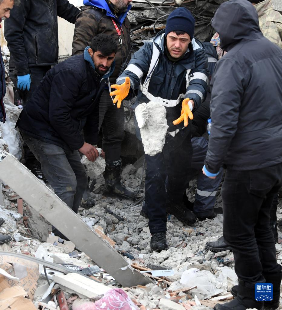 2月7日,在土耳其卡赫拉曼馬拉什省南部的埃爾比斯坦地區,救援人員在一處地震廢墟搜救。