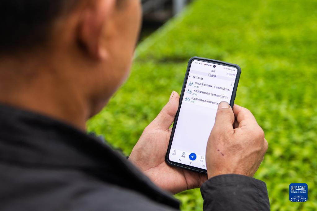2月8日,在鼎城區國家現代農業(yè)產(chǎn)業(yè)園一處蔬菜育苗基地,工作人員使用手機控制大棚內溫度、濕度。