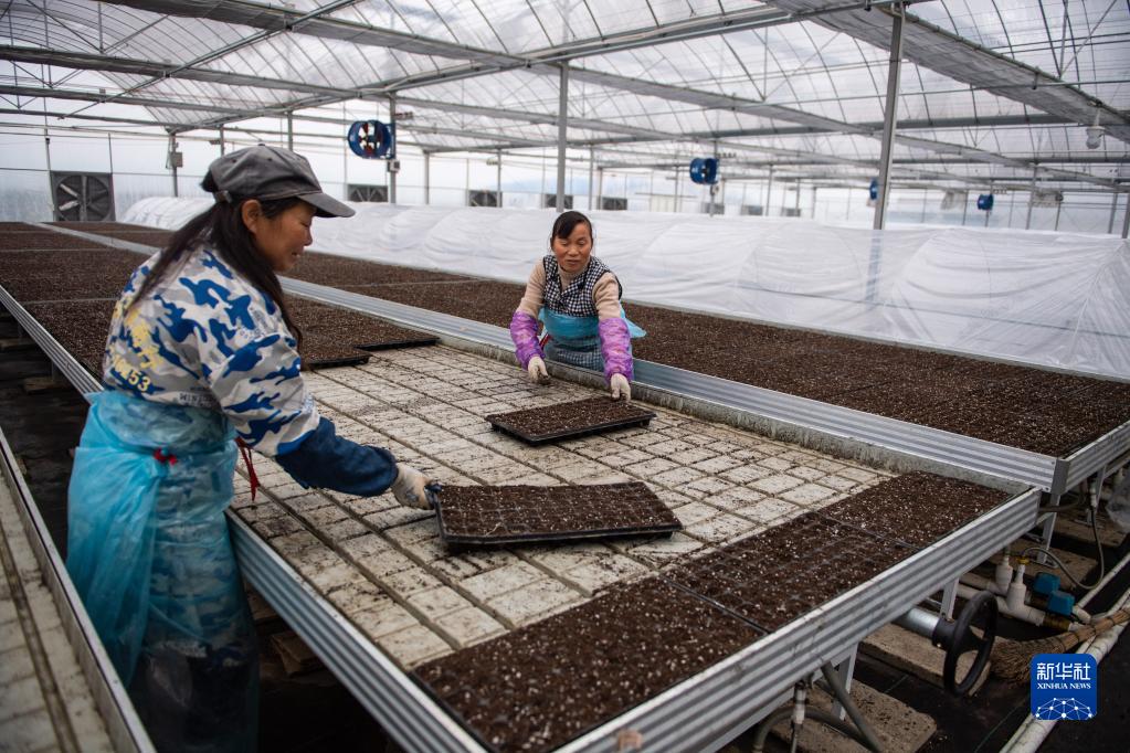 2月8日,在鼎城區國家現代農業(yè)產(chǎn)業(yè)園一處蔬菜育苗基地,工作人員在擺放蔬菜育苗盤(pán)。