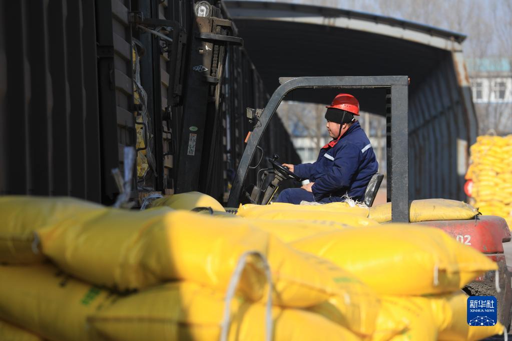 2月6日,在鐵嶺縣新臺子站,工人從火車(chē)上卸下化肥生產(chǎn)原料。