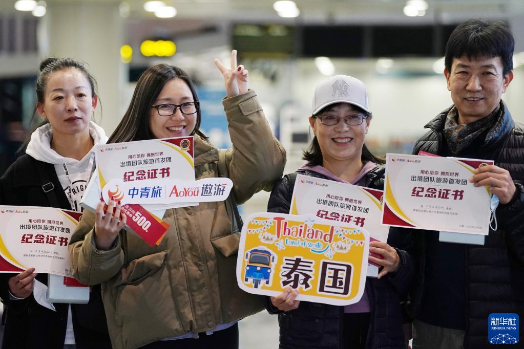 2月8日,在北京首都國際機場(chǎng)2號航站樓,出發(fā)前往泰國旅游的游客在機場(chǎng)合影留念。