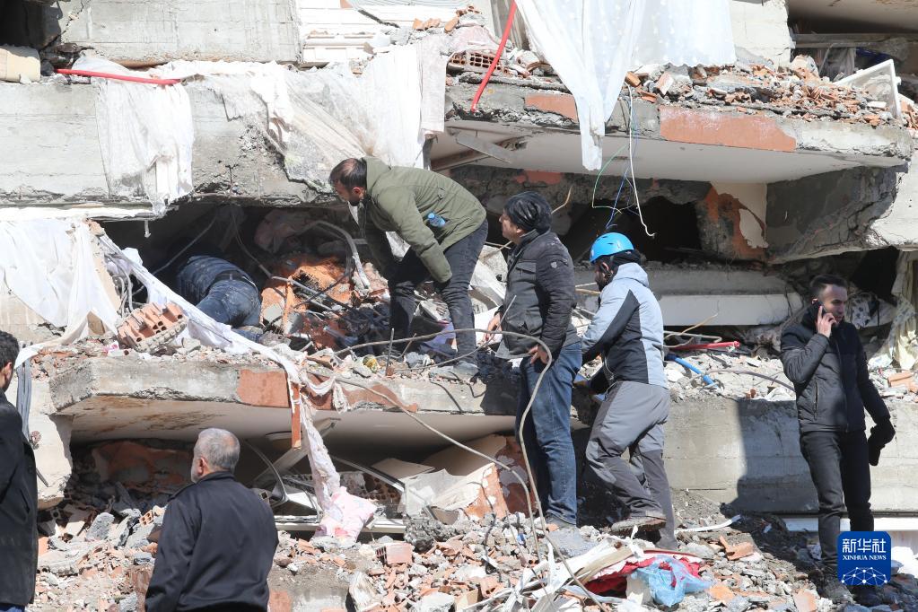 2月8日,在土耳其阿德亞曼省貝斯尼,救援人員在地震廢墟搜救。