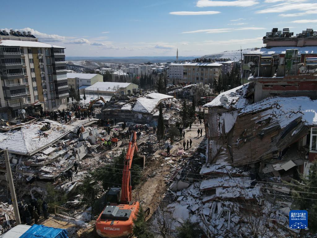 2月8日,在土耳其阿德亞曼省貝斯尼,救援人員在地震廢墟搜救(無(wú)人機照片)。
