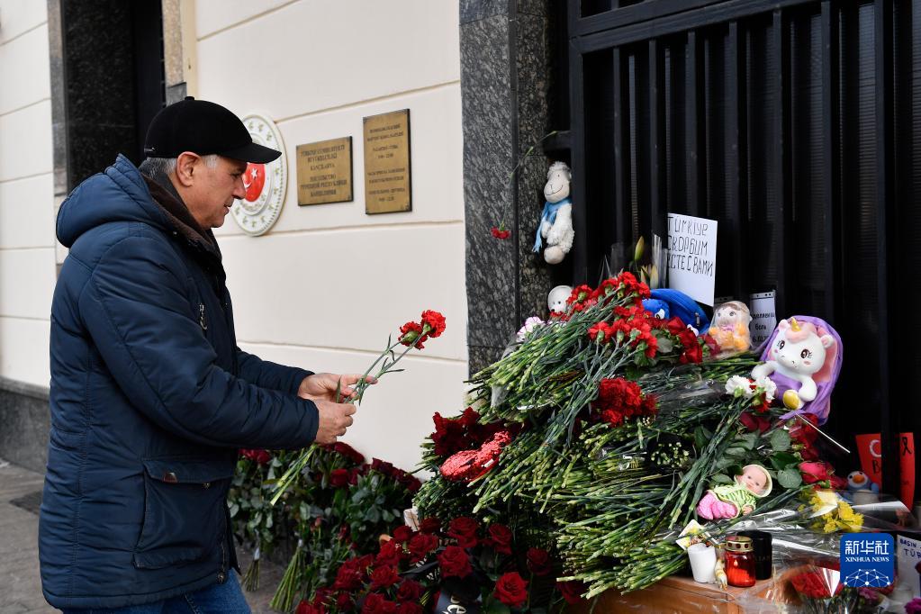 2月8日,莫斯科市民在土耳其駐俄羅斯大使館外獻花悼念地震遇難者。