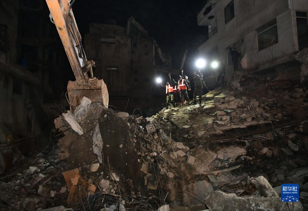 2月8日,救援人員在敘利亞大馬士革的一處地震廢墟搜救。