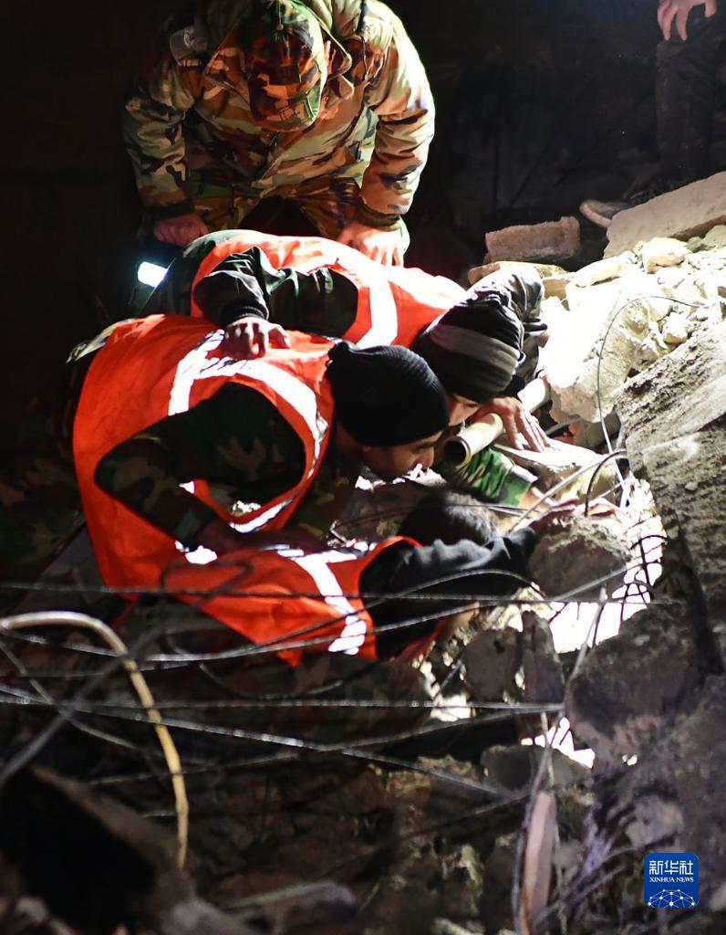2月8日,救援人員在敘利亞大馬士革的一處地震廢墟搜救。