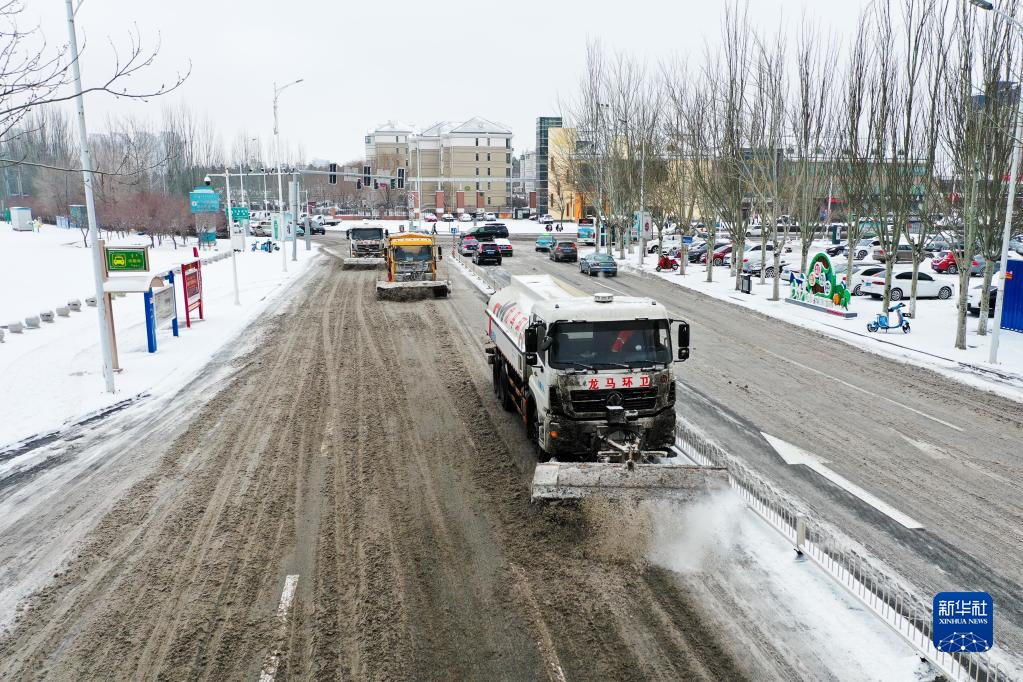 當日,內蒙古鄂爾多斯市迎來(lái)降雪天氣,路面出現積雪。當地環(huán)衛部門(mén)組織人力和大型機械清掃路面,保障市民出行安全。