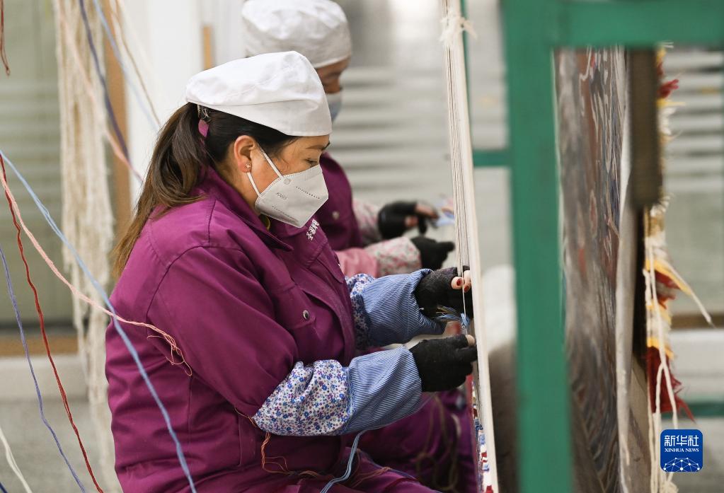 來(lái)自工廠(chǎng)附近湟中區東臺村的村民莫秀英(前)和工友在圣源地毯集團有限公司生產(chǎn)車(chē)間手工編織地毯(2月1日攝)。