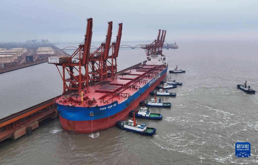 2月9日,一艘輪船在唐山港曹妃甸港區礦石碼頭卸載后準備離港(無(wú)人機照片)。