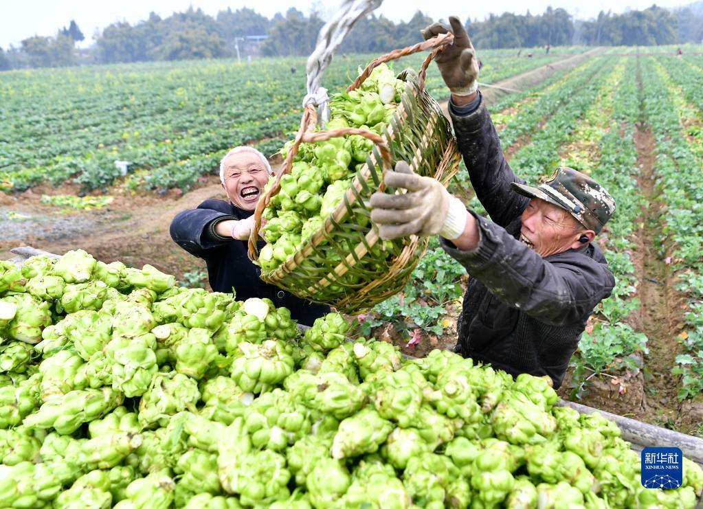 2月9日,四川省廣安市廣安區花橋鎮竹林村的農民將砍收的青菜頭裝車(chē)。