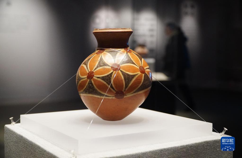 2月9日,在孔子博物館舉行的山東文物精品展上拍攝的山東省文物考古研究院收藏的大汶口文化花瓣紋彩陶壺。