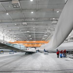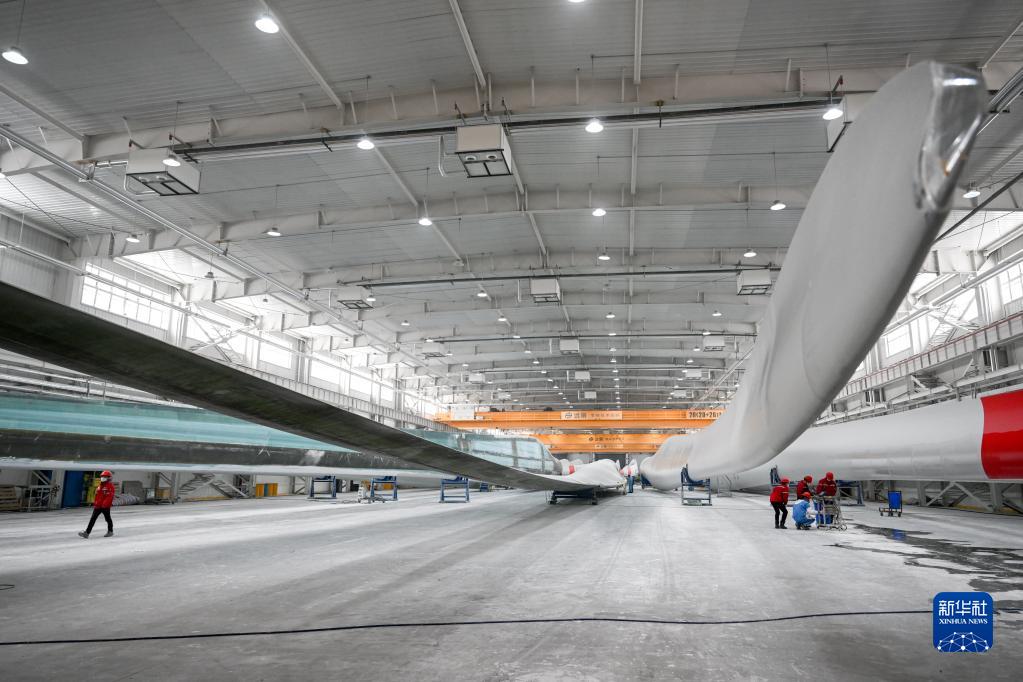 2月9日,在內蒙古烏蘭察布市遠景北方能源有限公司,質(zhì)檢員在風(fēng)機葉片生產(chǎn)線(xiàn)上工作。