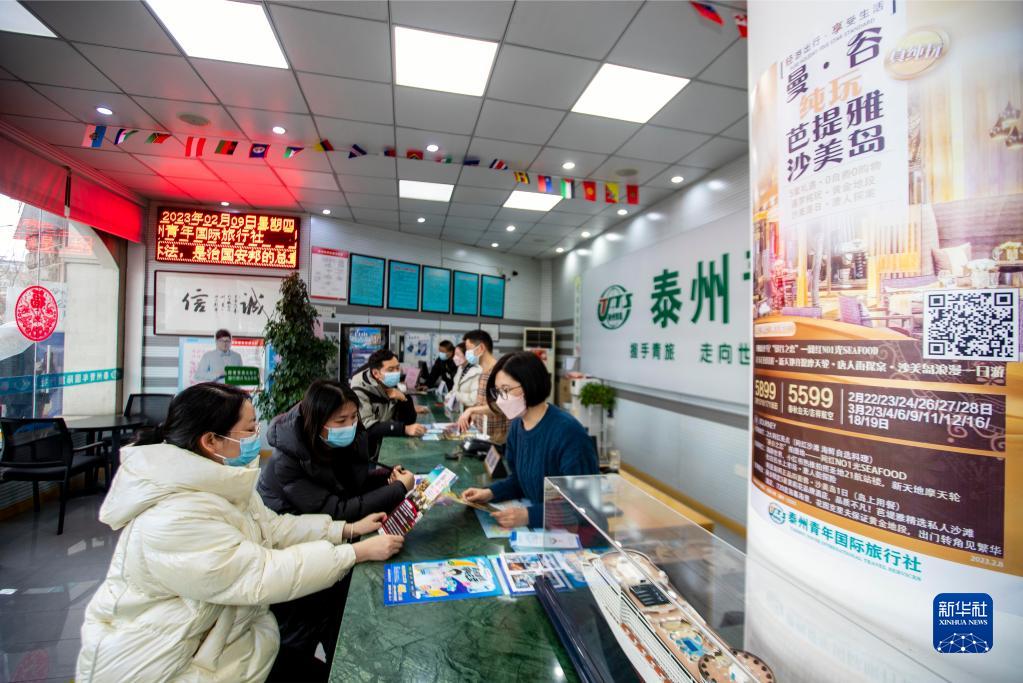 2月9日,市民在江蘇省泰州市青年國際旅行社銷(xiāo)售網(wǎng)點(diǎn)咨詢(xún)。