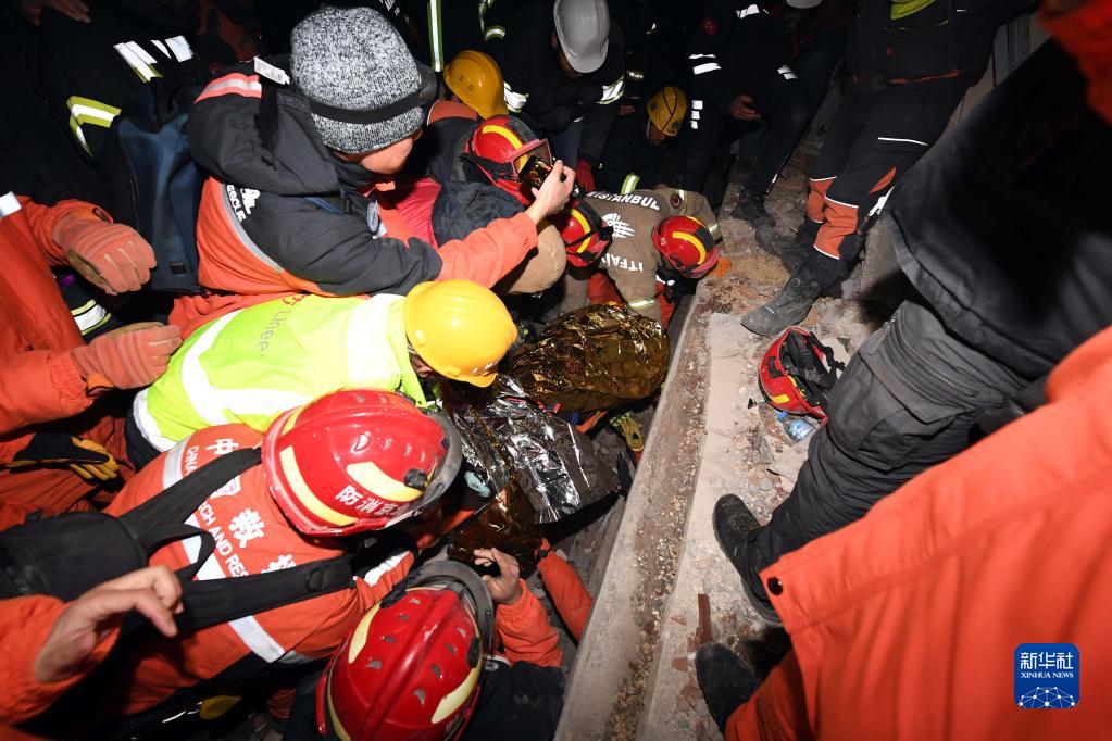 2月9日晚,在土耳其哈塔伊省安塔基亞市,中國救援隊與土耳其救援隊合力營(yíng)救出的幸存者被抬出廢墟。