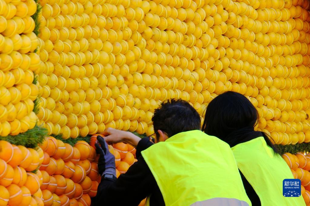 2月9日,在法國南部小城芒通,工作人員為檸檬節做最后準備。