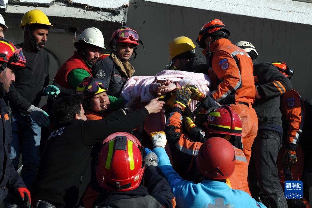 2月9日,在土耳其哈塔伊省安塔基亞市,中國救援隊與土耳其救援隊轉移一名救出的女性幸存者。