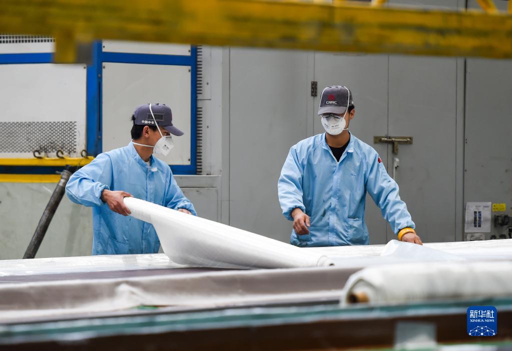 2月9日,工人在株洲時(shí)代新材料科技股份有限公司蒙西分公司風(fēng)力發(fā)電葉片生產(chǎn)車(chē)間內作業(yè)。