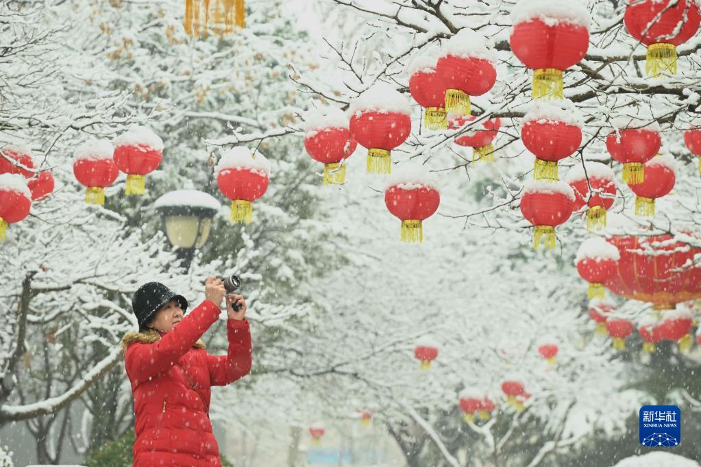 2月9日,市民在河北省石家莊市橋西區元南公園拍攝雪景。