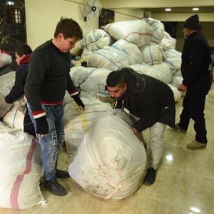 2月9日,在黎巴嫩的黎波里,人們搬運援助敘利亞拉塔基亞的物資。