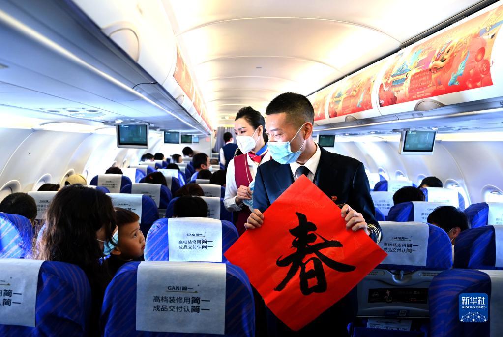 馬保利在飛機上與乘客以“春”為題玩“飛花令”(2月4日攝)。