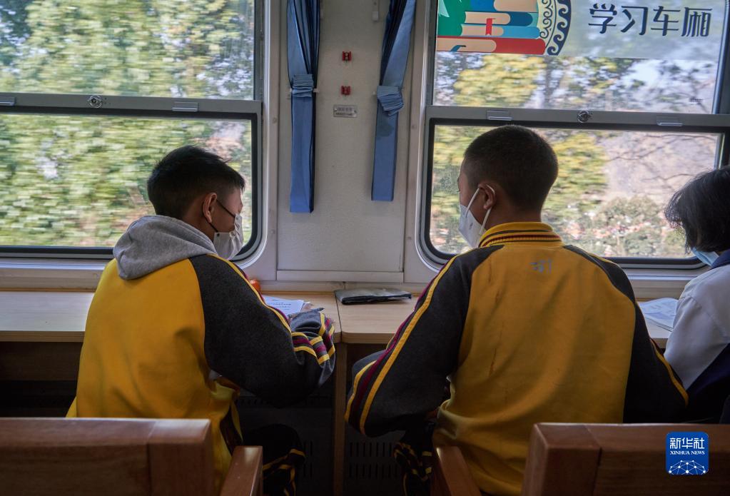 2月9日,學(xué)生在5633次列車(chē)上的學(xué)習車(chē)廂交流。