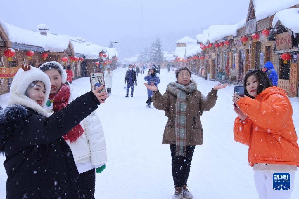 2月10日,在黑龍江大海林林業(yè)局有限公司雙峰林場(chǎng),游客在街頭游覽拍照。