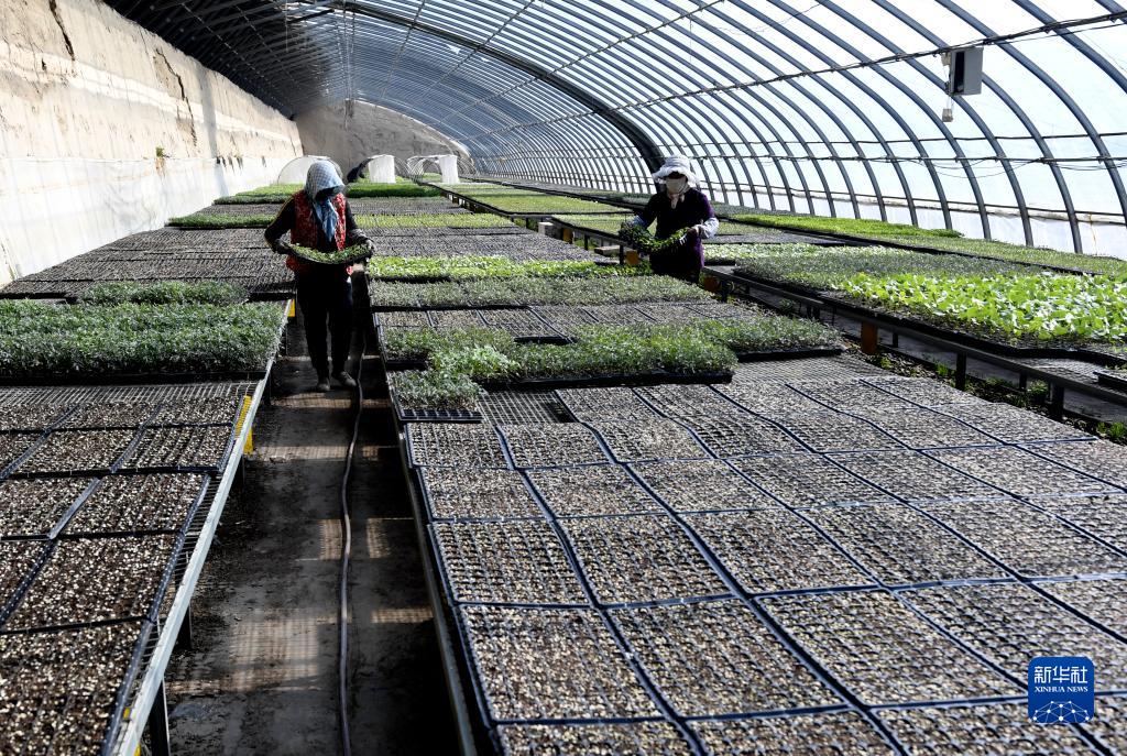 2月10日,在甘肅省永靖縣三塬鎮一家種苗培育基地,農民在大棚里搬運苗盤(pán)。